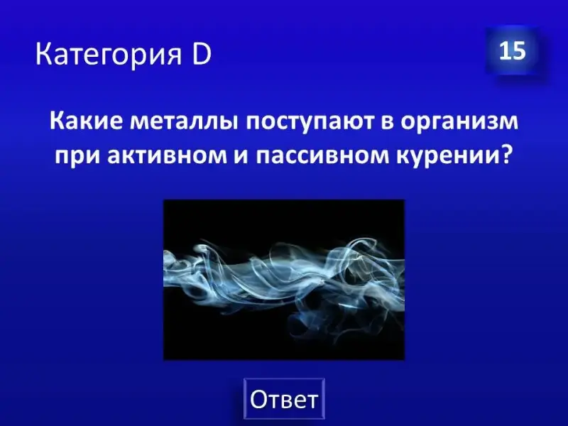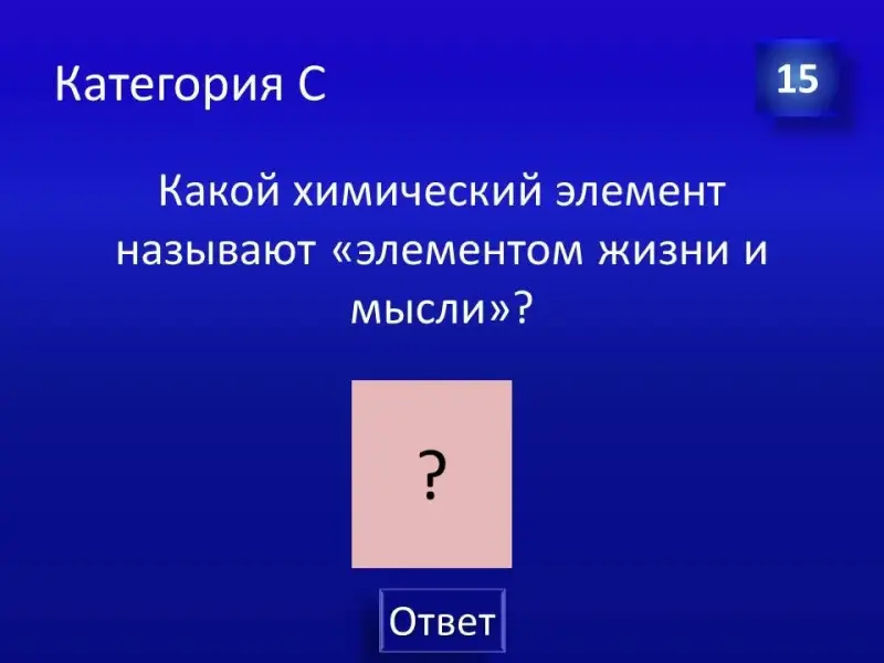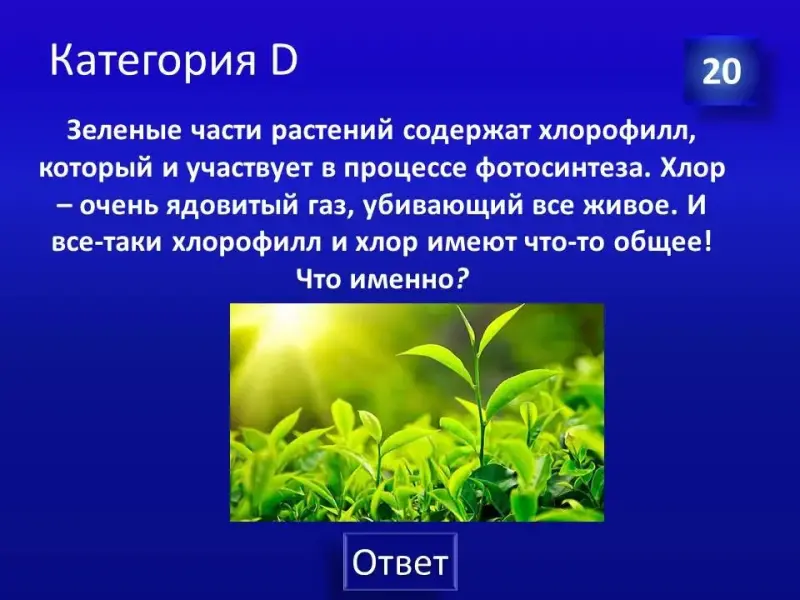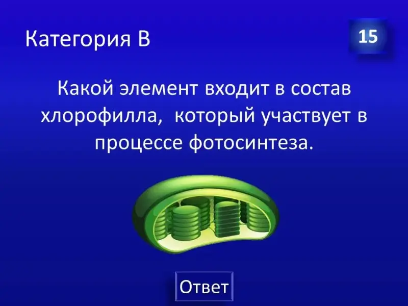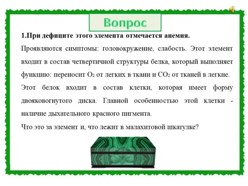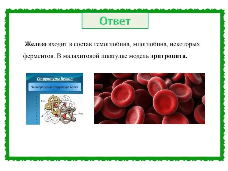 (Слайд 29). Правильный ответ: химический элемент - Железо, которое входит в состав гемоглобина, миоглобина, некоторых ферментов. В малахитовой шкатулке модель эритроцита.