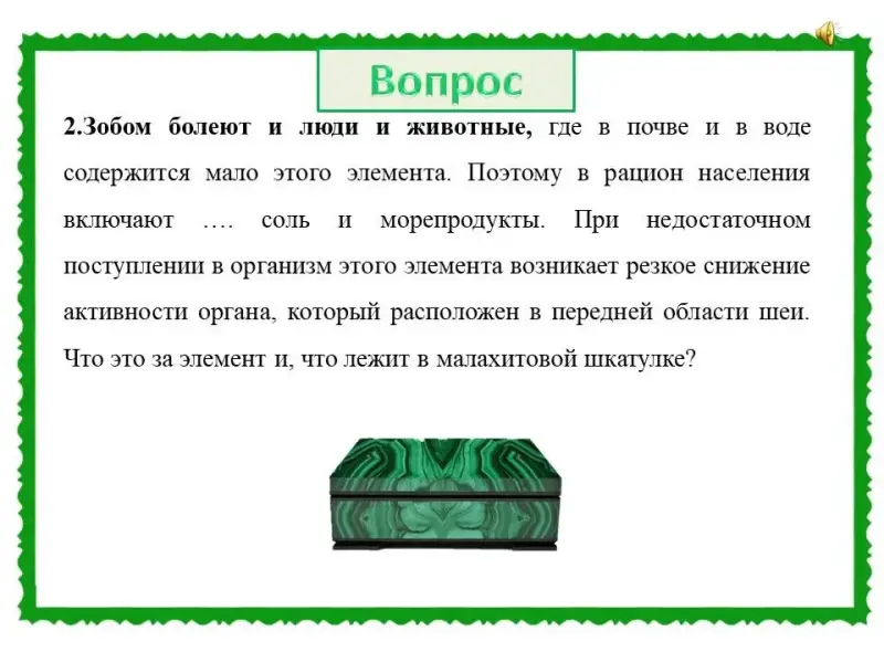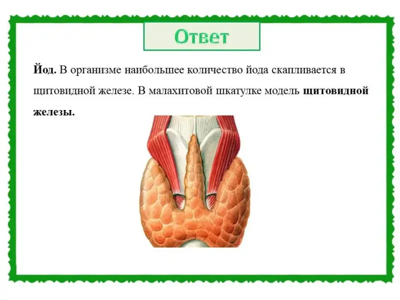 (Слайд 32). Правильный ответ: химический элемент - йод. В организме наибольшее количество йода скапливается в щитовидной железе. В малахитовой шкатулке модель щитовидной железы.