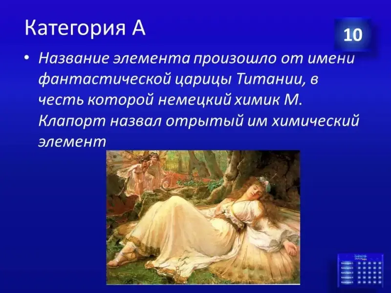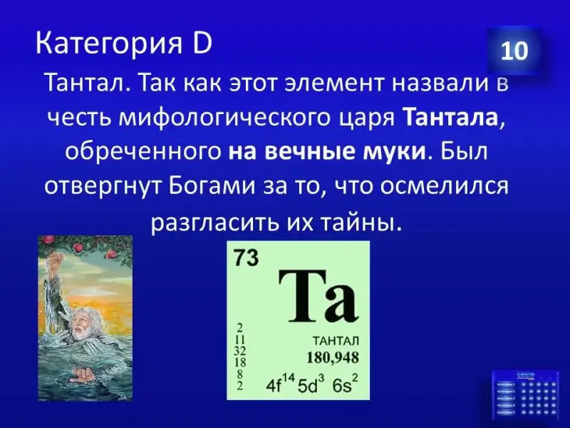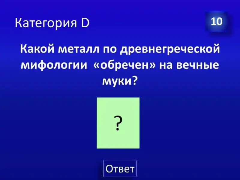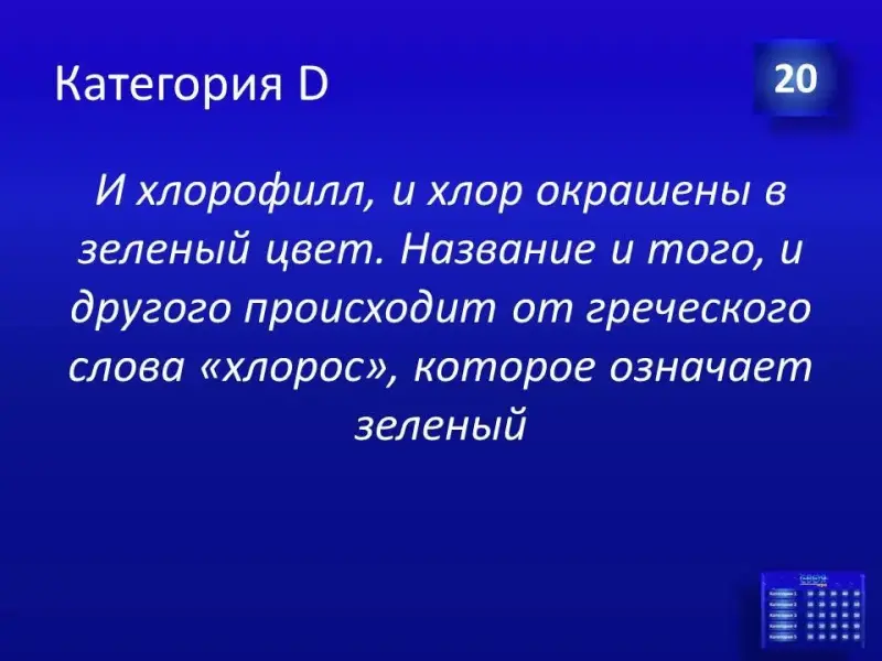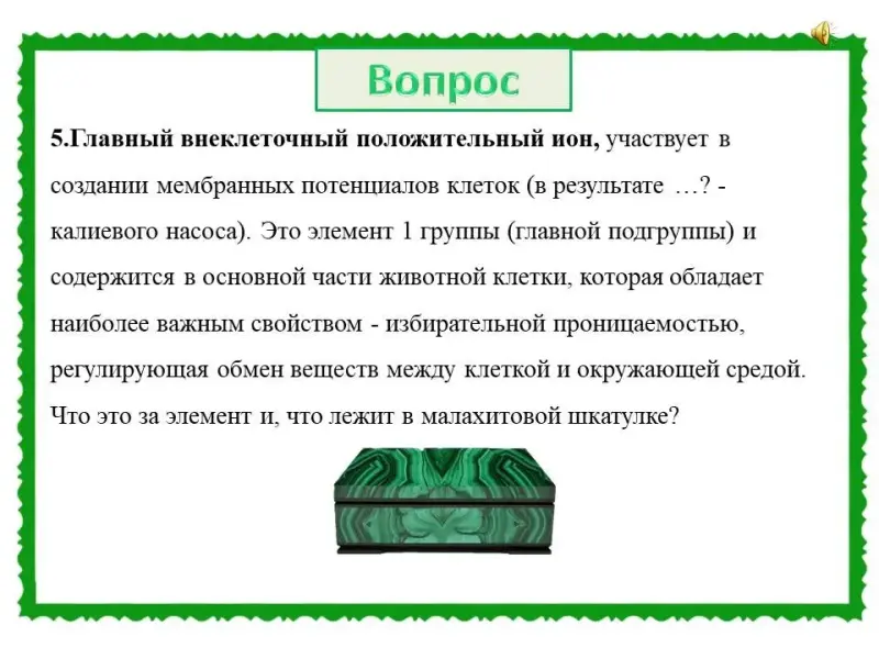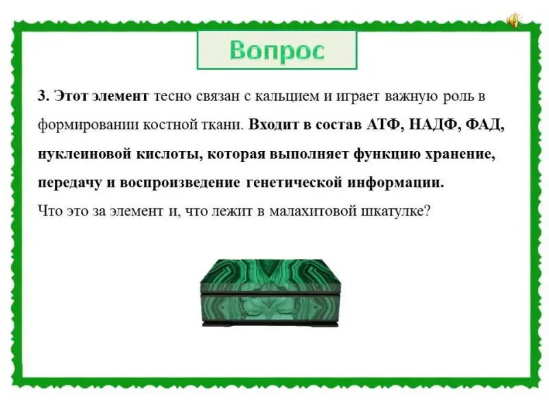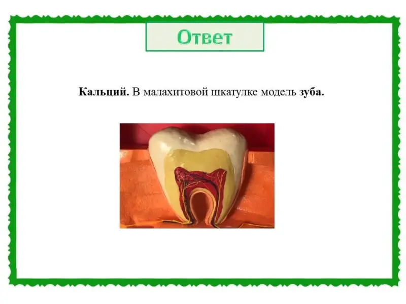 (Слайд 44). Правильный ответ: химический элемент - кальций. В малахитовой шкатулке модель зуба.