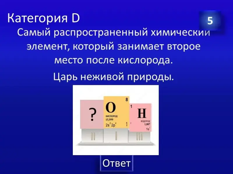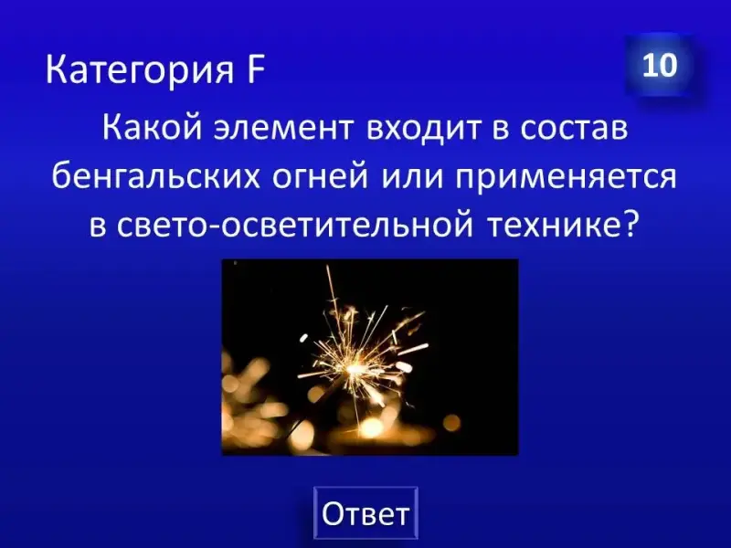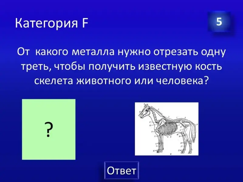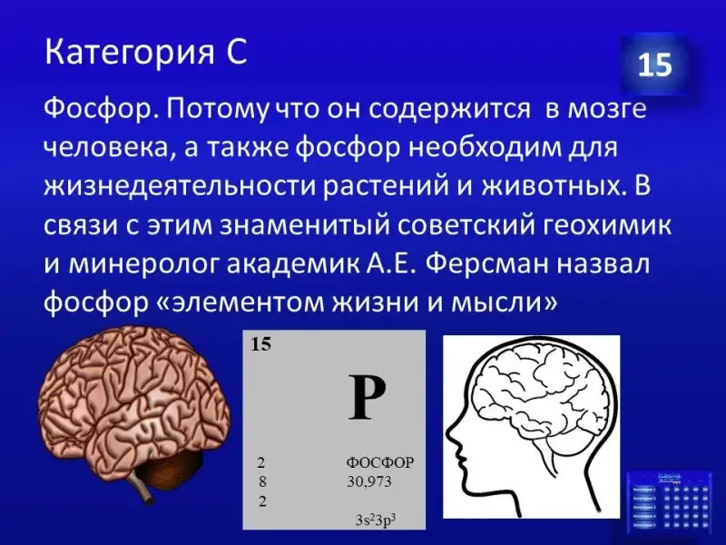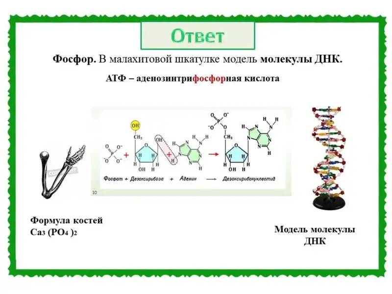 (Слайд 35). Правильный ответ: химический элемент Фосфор. Например: полное название АТФ - аденозинтрифосфорная кислота. Формула костей: фосфат кальция.