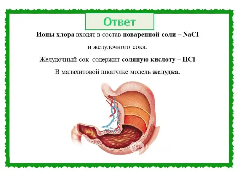 (Слайд 38). Правильный ответ: Ионы хлора входят в состав поваренной соли - NaCI и желудочного сока.