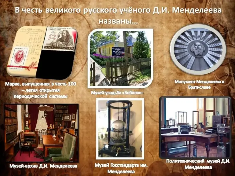 Менделеев был членом более 90 академий наук, научных обществ, университетов разных стран. Он являлся одним из основателей Русского химического общества; неоднократно избирался его президентом. В1964 году имя Менделеева было занесено на доску почета Бриджпортского университета в США наряду с именами Эвклида, Архимеда, Коперника, Галилея, Ньютона, Лавуазье. (Слайд 7)