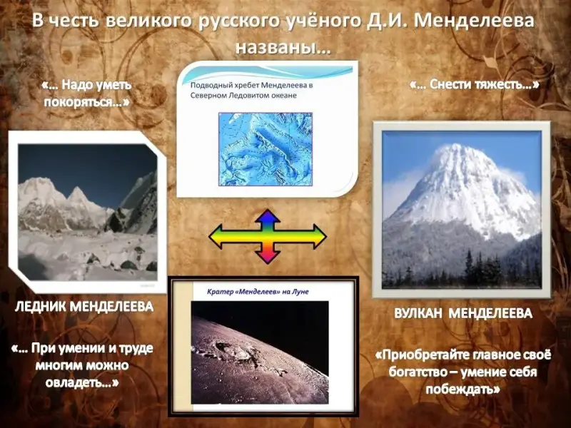 - Подводный хребет им Д.И.Менделеева в центральной части Северного ледовитого океана.