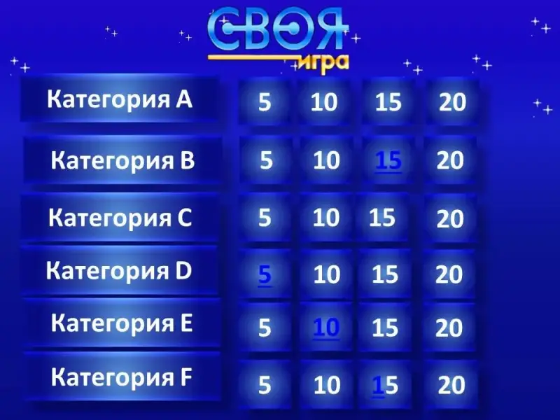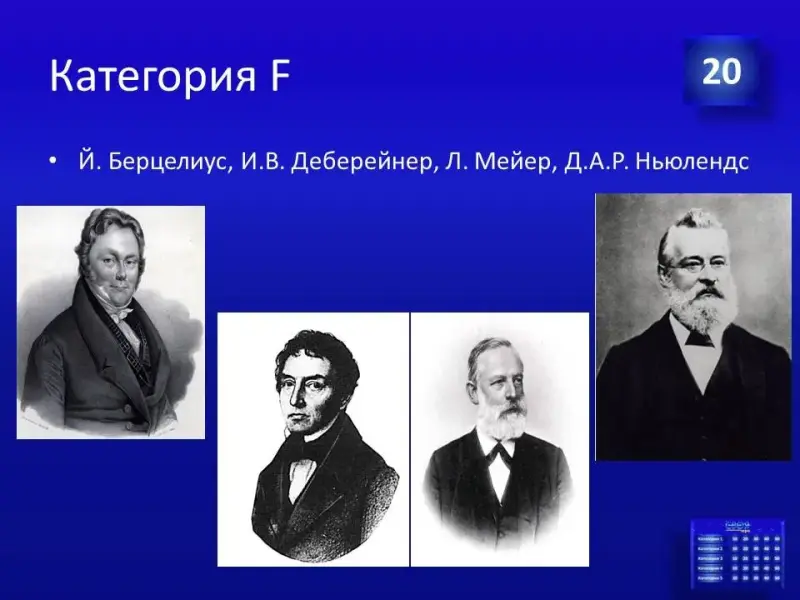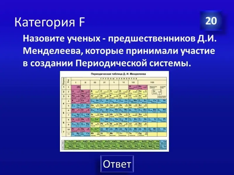 1. Химическая викторина «Периодическая система химических элементов». (Презентация №2). Вашему вниманию предлагаются вопросы на 5, 10, 15, 20 баллов. Команда должна выбрать и ответить на четыре вопроса используя каждый столбик. Например: С5, А10, F15, D20.