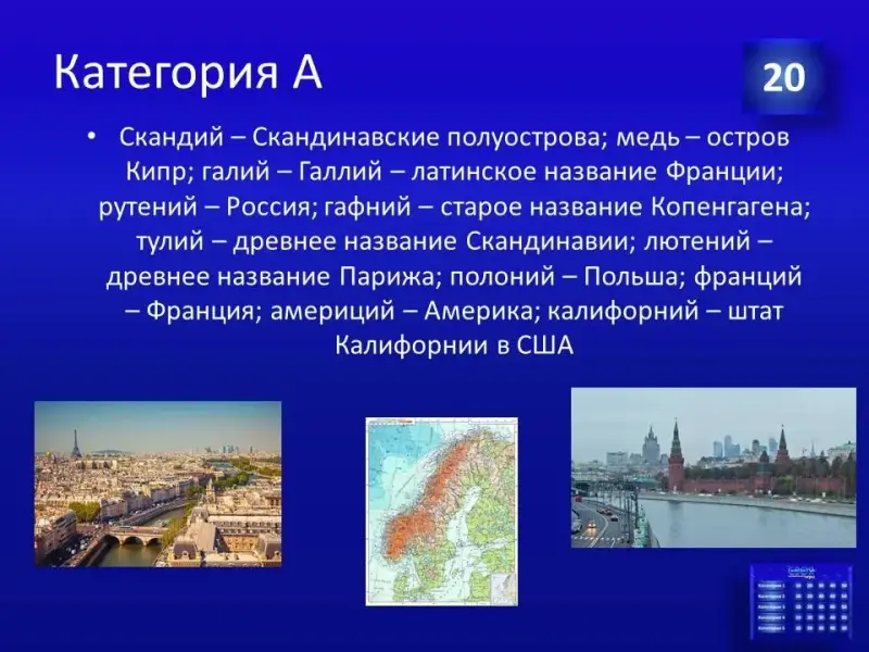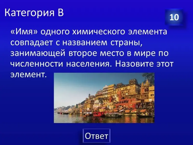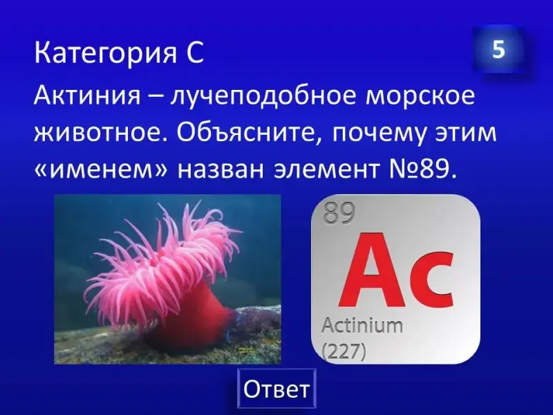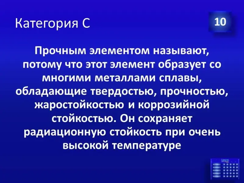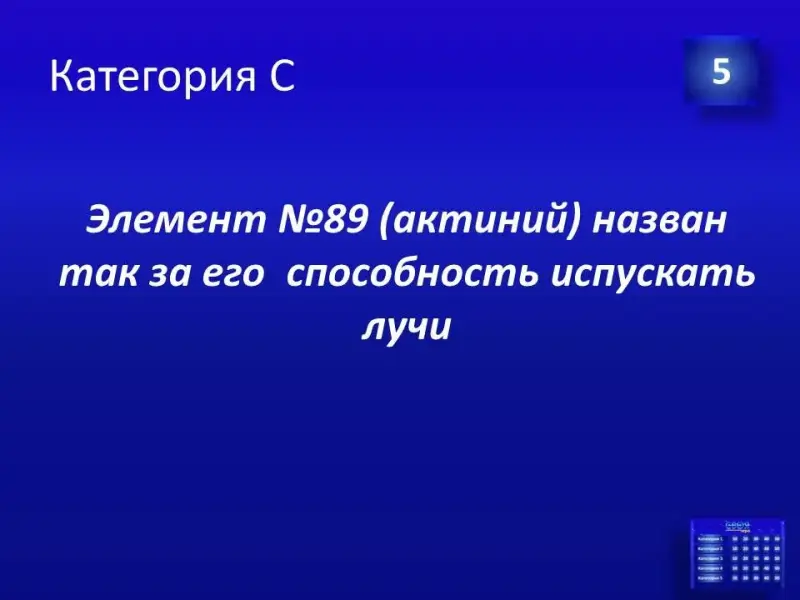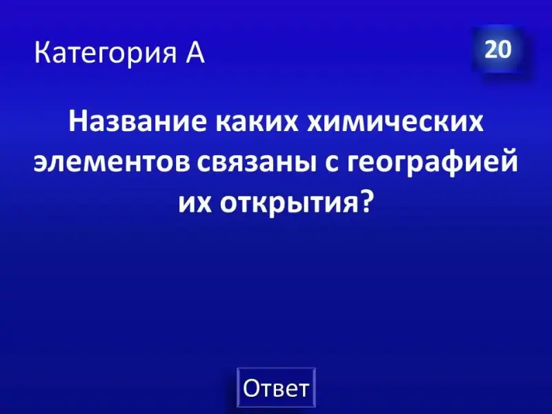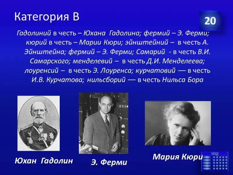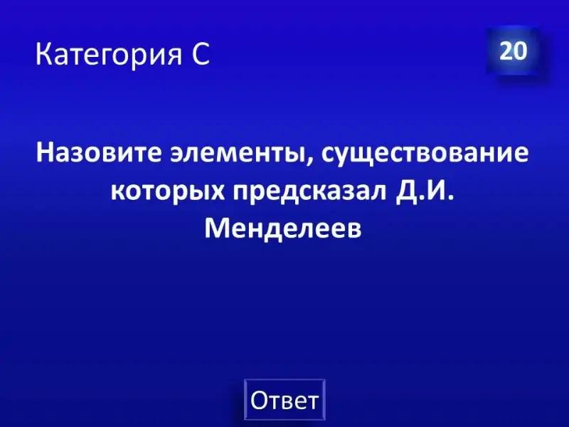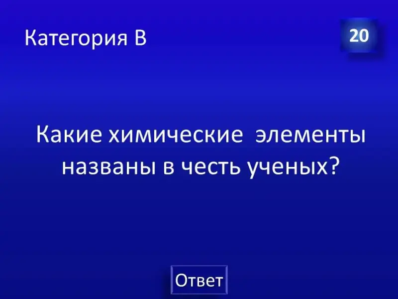 Следующее конкурсное задание: необходимо продолжить фразу «В честь великого русского ученого Д.И.Менделеева названы…» приблизительные ответы: