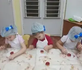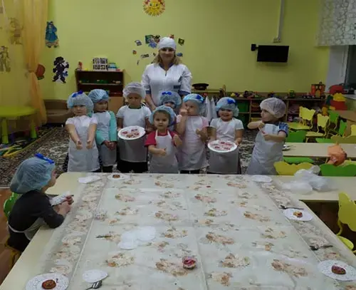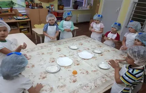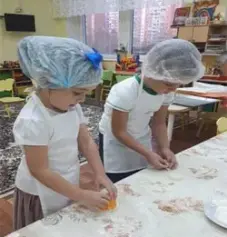 Воспитатель проводит беседу кулинарного мастерства, напоминает детям о правилах при работе с тестом и юные гурманы превращаются в настоящих пекарей.