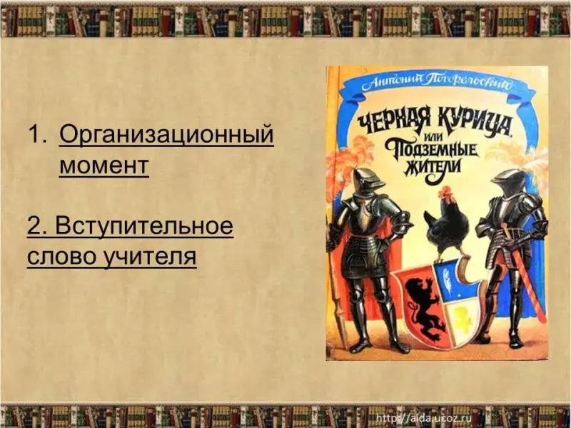 - Мы с вами, ребята, прочитали много замечательных книг. И вот познакомились ещё с одним писателем, с его удивительной сказкой «Черная курица, или Подземные жители». Красивая, тихая, грустная сказка о тайном мире подземных рыцарей, о чудесном превращении курицы Чернушки, о загадочном подземном народе... И сегодня, ребята, мне хочется поговорить с вами об этой сказке, о чудесах, которые происходят с героями, о честности, бескорыстии, о высоте чувств, о вере в добро и, конечно, о дружбе и предательстве.