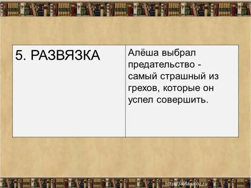 - Автор подчеркивает доброту Алёши. А когда доброта Алёшиного нрава проявляется? (Например, он воображал, что директор пансиона должен быть какой-нибудь знаменитый рыцарь в блестящих латах и в шлеме с большими перьями, но увидел не шлем пернатый, а просто маленькую лысую головку, набело распудренную, единственным украшением которой был маленький пучок. И Алёше стало жалко этого человека).