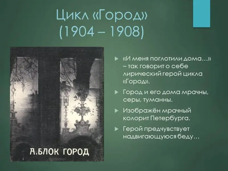 Слово учителя. «И меня поглотили дома…» - так говорит о себе лирический герой цикла «Город». Город и его дома мрачны, серы, туманны. Изображён мрачный колорит Петербурга. Герой предчувствует надвигающуюся беду…