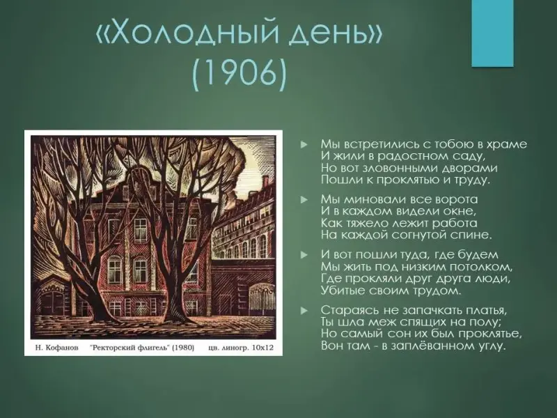 - Каковы реалии быта лирического героя? (Тяжёлый труд, согбенные спины, низкий потолок», чердак, «колодезь двора»)