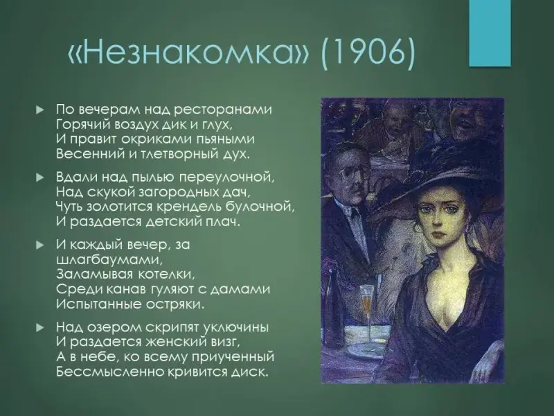 - Как меняется внутреннее состояние героя при виде Прекрасной Незнакомки? (Образ Незнакомки - символ красоты, романтики, высоких чувств. Лирический герой теперь понимает, что для него не всё потеряно. Он может вырваться из мира рутины, обыденности и тоски)