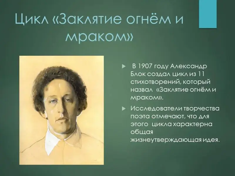 Слово учителя. В 1907 году Александр Блок создал цикл из 11 стихотворений, который назвал «Заклятие огнём и мраком». Для этого цикла характерна общая жизнеутверждающая идея, рождение сильной, мужественной личности в его лирике.
