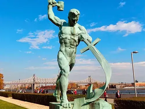 Ответ: Композиция «Перекуем мечи на орала» работы Е.В. Вучетича в 1957 году стала подарком Советского Союза правительству США в знак дружбы, и по сей день один из символов мира находится у штаб-квартиры ООН в Нью-Йорке. Мускулистый пахарь тяжелым молотом перековывает оружие в мирный плуг - при работе над этим образом скульптор очень долго искал натурщика, и считается, что лепил Вучетич с олимпийского чемпиона по борьбе Бориса Гуревича. За скульптуру «Перекуем мечи на орала» автор был награжден серебряной медалью Совета Мира и получил Гран-при на выставке в Брюсселе. В аллегорической композиции «Перекуем мечи на орала» рабочий перековывает меч в плуг, а сама скульптура символизирует стремление людей бороться за разоружение во имя торжества мира на планете. Название статуи - призыв к отказу от распрей и вражды, к мирной, созидательной жизни - взято из Старого завета, где предсказывается, что народы мира перестанут воевать. А оружие переделают в плуги и серпы.