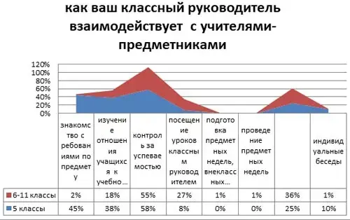 По мнению учащихся, самой распространенной формой является контроль за успеваемостью учащихся по предмету (58% и 55%). Для 6-11 классов важной формой является изучение отношения учащихся к ученому предмету. Также четверть отметила, что обеспечение взаимодействия родителей и учителей для решения проблем является важной формой взаимодействия учителей и классного руководителя. 10% выделили индивидуальные беседы. 8% отметили, что классный руководитель посещает уроки предметников. Никто из опрошенных не отметил, что классный руководитель вовлечён в подготовке и проведении предметных недель.
