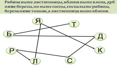Задача. На пришкольном участке растут 8 деревьев: яблоня, тополь, береза, рябина, дуб, клен, лиственница и сосна. Рябина выше лиственницы, яблоня выше клена, дуб ниже березы, но выше сосны, сосна выше рябины, береза ниже тополя, а лиственница выше яблони. Расположите деревья от самого низкого к самому высокому.