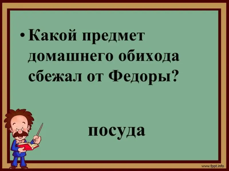 8. Какой предмет домашнего обихода сбежал от Федоры? Посуда
