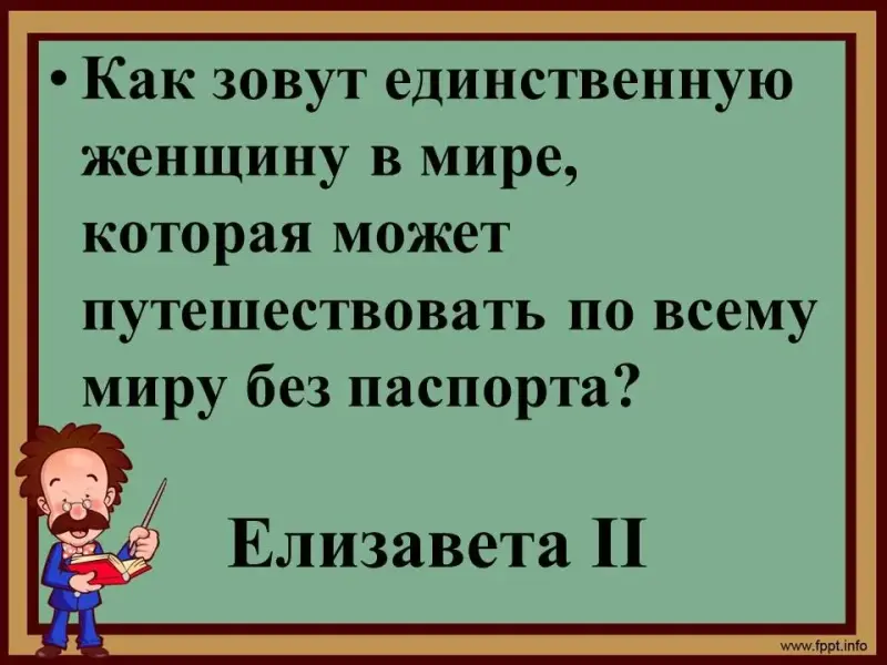 14. Как зовут единственную женщину в мире, которая может путешествовать по всему миру без паспорта? Елизавета II