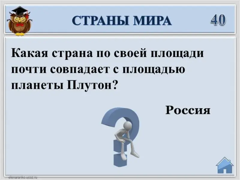 4. Какая страна по своей площади почти совпадает с площадью планеты Плутон? Россия