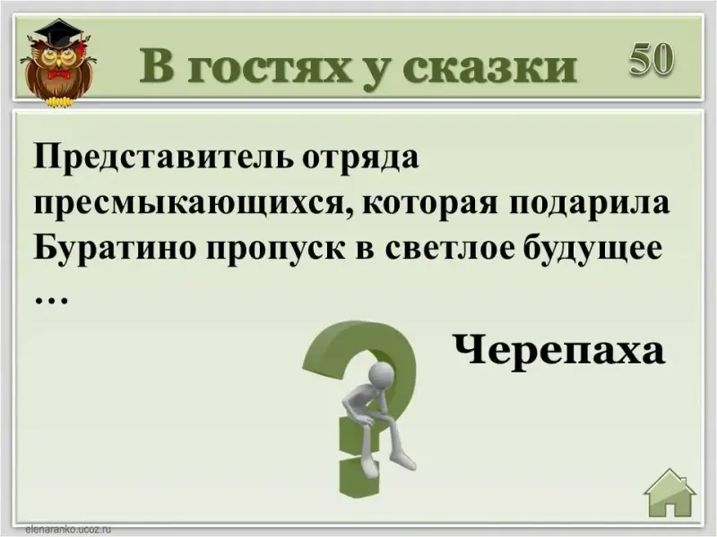 5. Представитель отряда пресмыкающихся, которая подарила Буратино пропуск в светлое будущее? Черепаха