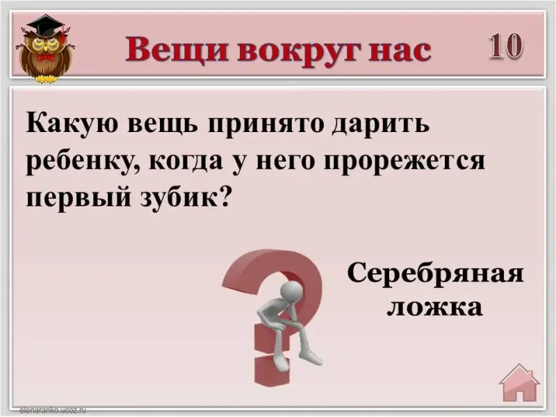 1. Какую вещь принято дарить ребенку, когда у него прорежется первый зубик? Серебряную ложку