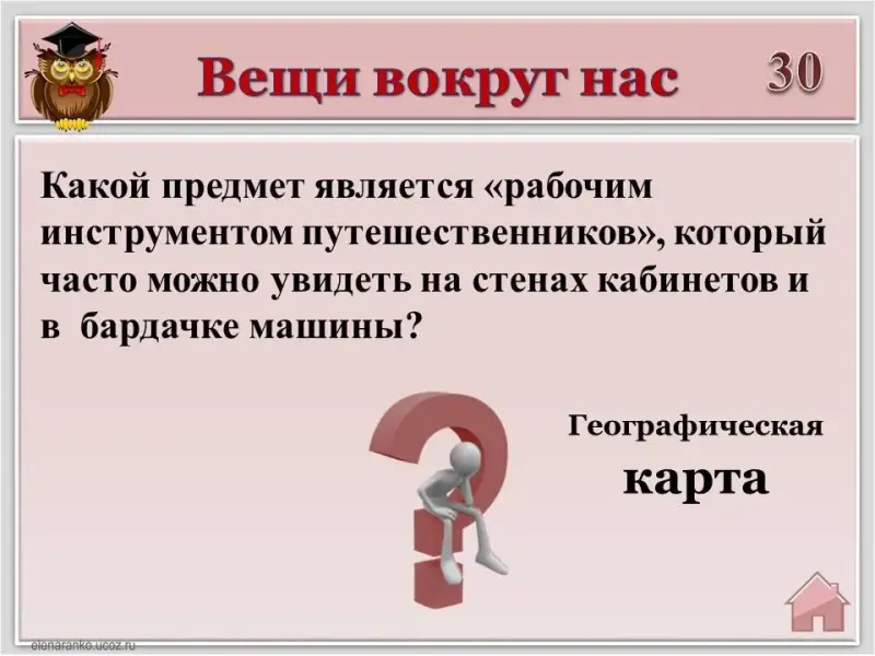 3. Какой предмет является «рабочим инструментом путешественников», который часто можно увидеть на стенах кабинетов и в бардачке машины? Географическая карта