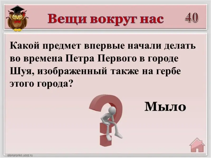 4. Какой предмет впервые начали делать во времена Петра Первого в городе Шуя, этот же предмет изображен и на гербе этого города? Мыло