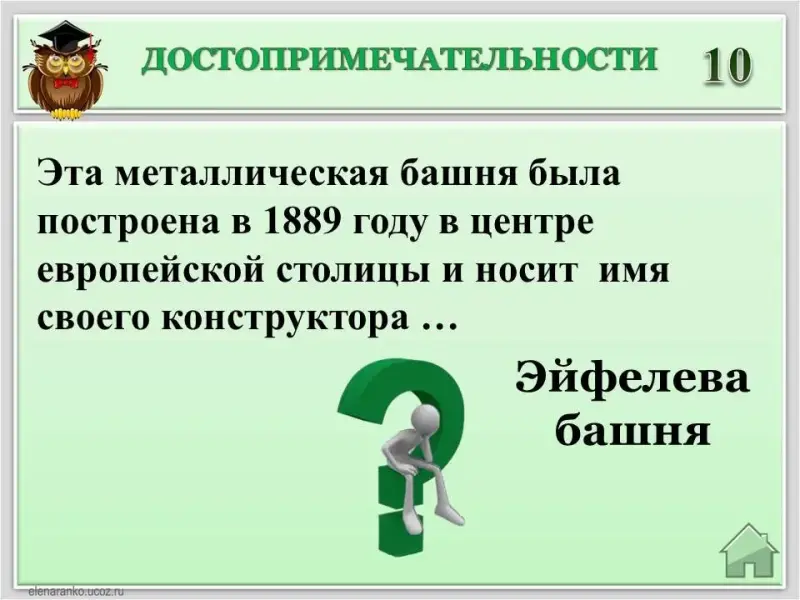 1. Эта металлическая башня была построена в 1889 году в центре европейской столицы и носит имя своего конструктора? Эйфелева башня