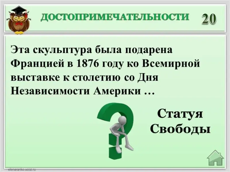 2. Эта скульптура была подарена Францией в 1876 году ко Всемирной выставке к столетию со Дня Независимости Америки? Статуя Свободы