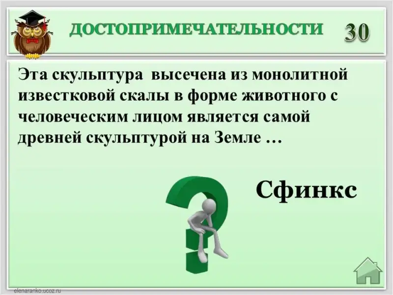 3. Эта скульптура высечена из монолитной известковой скалы в форме животного с человеческим лицом является самой древней скульптурой на Земле? Сфинкс