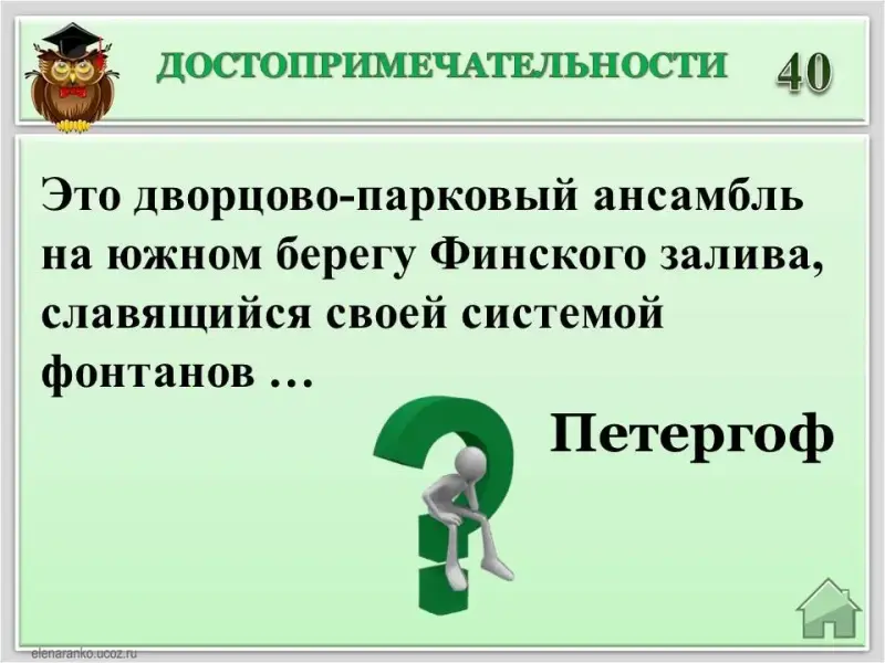 4. Это дворцово-парковый ансамбль на южном берегу Финского залива, славящийся своей системой фонтанов? Петергоф