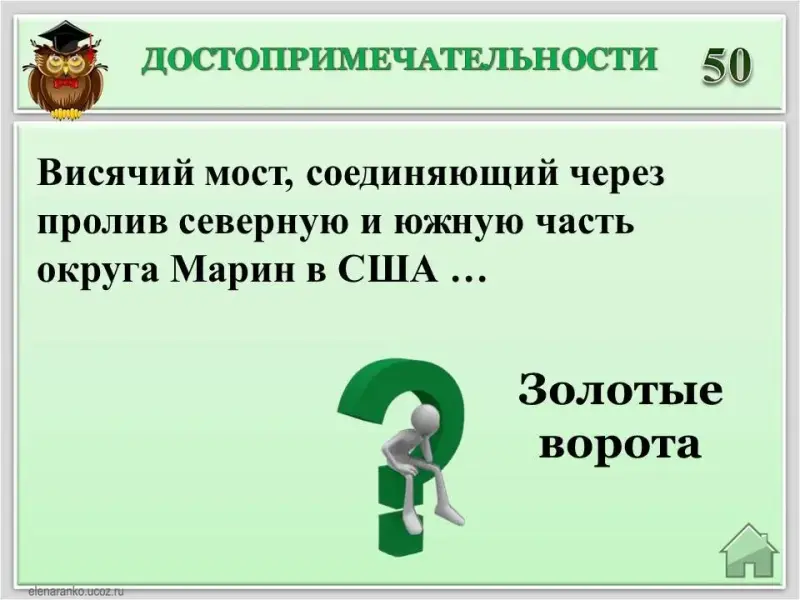 5. Висячий мост, соединяющий через пролив северную и южную часть округа Марин в США? Золотые ворота