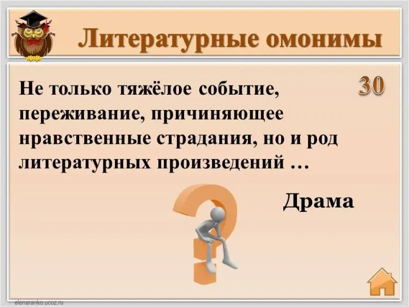 3. Не только тяжёлое событие, переживание, причиняющее нравственные страдания, но и род литературных произведений? Драма
