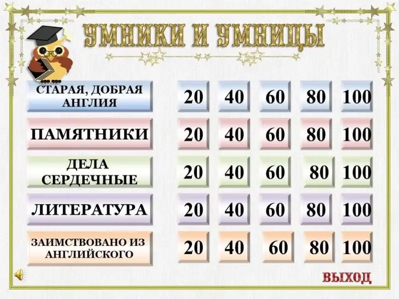 Интеллектуальная игра «Умники и умницы» в игровой форме обобщает знания учащихся о литературе и филологии, о разных странах на основе их достопримечательностей, культуры, традиций, об интересных вещах вокруг нас и используется в качестве основного материала для проведения игры в средних и старших классах общеобразовательных школ или на первом курсе учреждений среднего профессионального образования.
