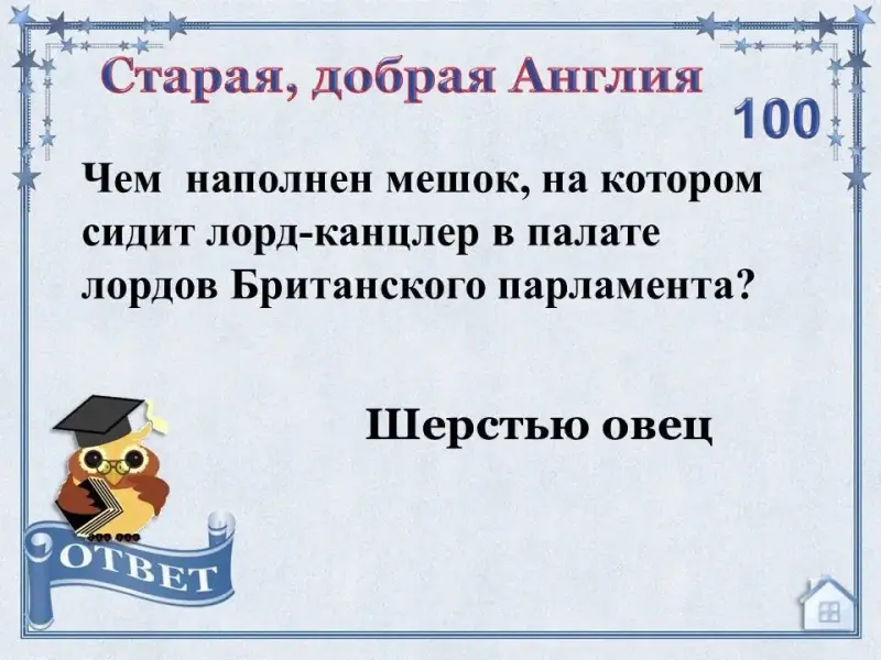 5. Чем наполнен мешок, на котором сидит лорд-канцлер в палате лордов Британского парламента? Шерстью овец