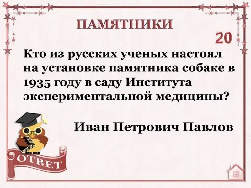 1. Кто из русских ученых настоял на установке памятника собаке в 1935 году в саду Института экспериментальной медицины? Иван Петрович Павлов