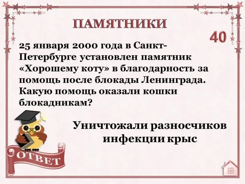 2. 25 января 2000 года в Санкт-Петербурге установлен памятник «Хорошему коту» в благодарность за помощь после блокады Ленинграда. Какую помощь оказали кошки блокадникам? Уничтожали