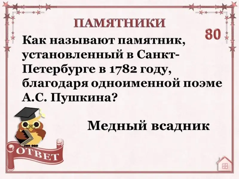 4. Как называют памятник, установленный в Санкт-Петербурге в 1782 году, благодаря одноименной поэме А.С. Пушкина? Медный Всадник