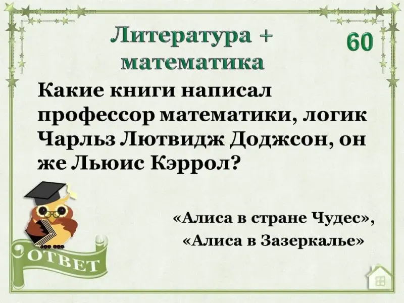 3. Какие книги написал профессор математики, логик Чарльз Лютвидж Доджсон, он же Льюис Кэррол? «Алиса в стране Чудес», «Алиса в Зазеркалье»
