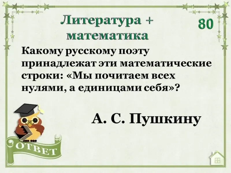 4. Какому русскому поэту принадлежат эти математические строки: «Мы почитаем всех нулями, а единицами себя»? А.С.Пушкину