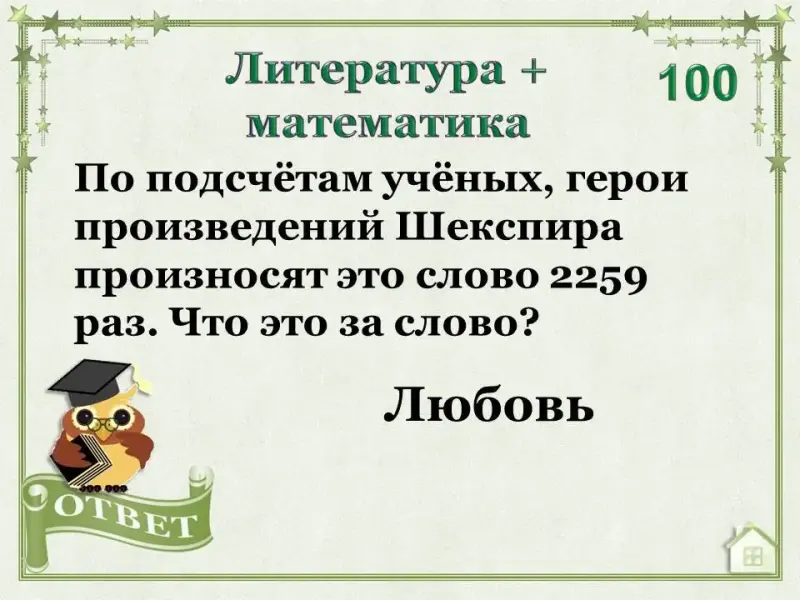 5. По подсчётам учёных, герои произведений Шекспира произносят это слово 2259 раз. Что это за слово? Любовь