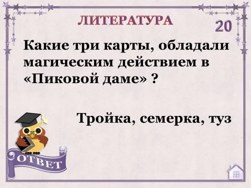1. Какие три карты, обладали магическим действием в «Пиковой даме»? Тройка, семерка, туз