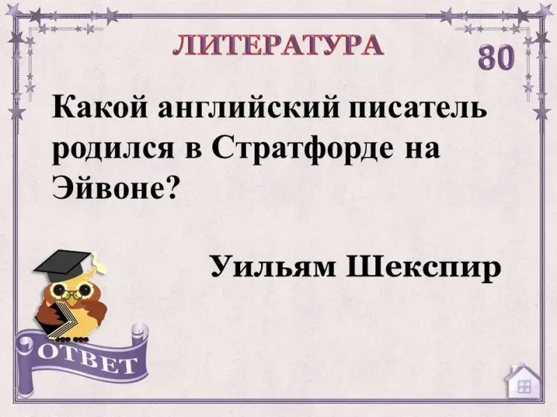 4. Какой английский писатель родился в Стратфорде на Эйвоне? Уильям Шекспир