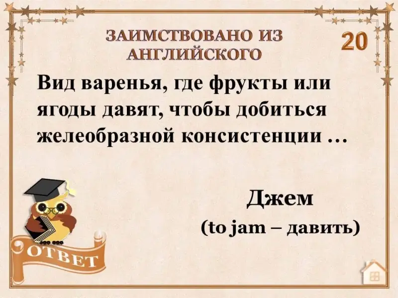 1. Вид варенья, где фрукты или ягоды давят, чтобы добиться желеобразной консистенции? Джем (to jam - давить)