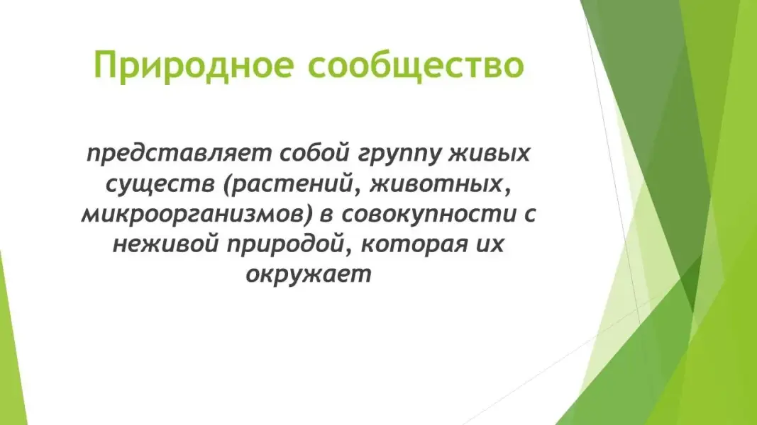 - Природное сообщество представляет собой группу живых существ (растений, животных, микроорганизмов) в совокупности с неживой природой, которая их окружает.