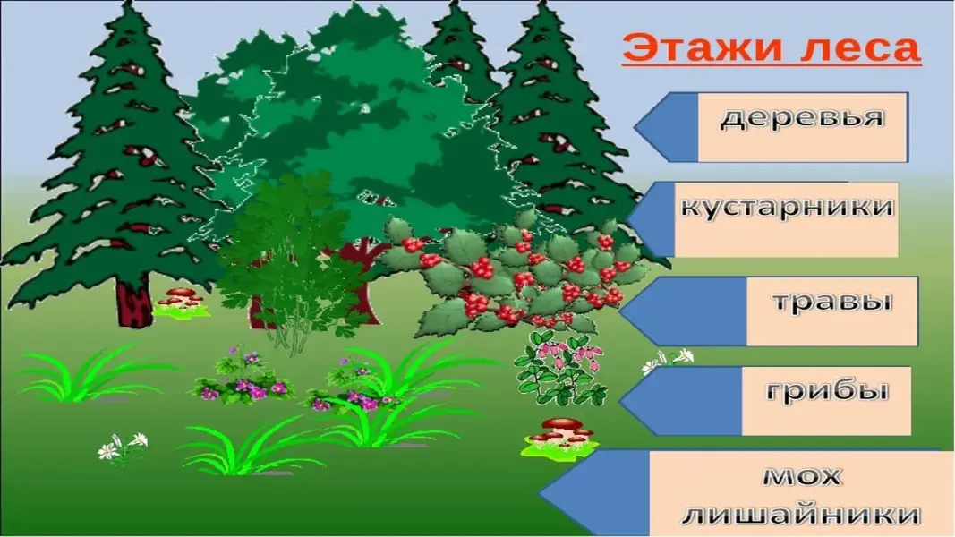 Автор. Так заяц узнал, что наш лес - многоэтажный, или многоярусный. Каждое растение в нём своё место занимает, свой ярус.