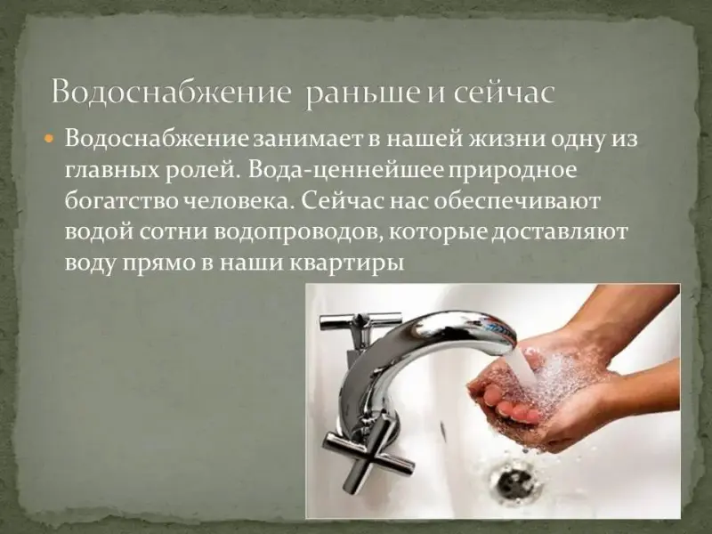 Слайд 2. Водоснабжение занимает в нашей жизни одну из главных ролей. Вода - ценнейшее природное богатство человека. Сейчас нас обеспечивают водой сотни водопроводов, которые доставляют воду прямо в наши квартиры.