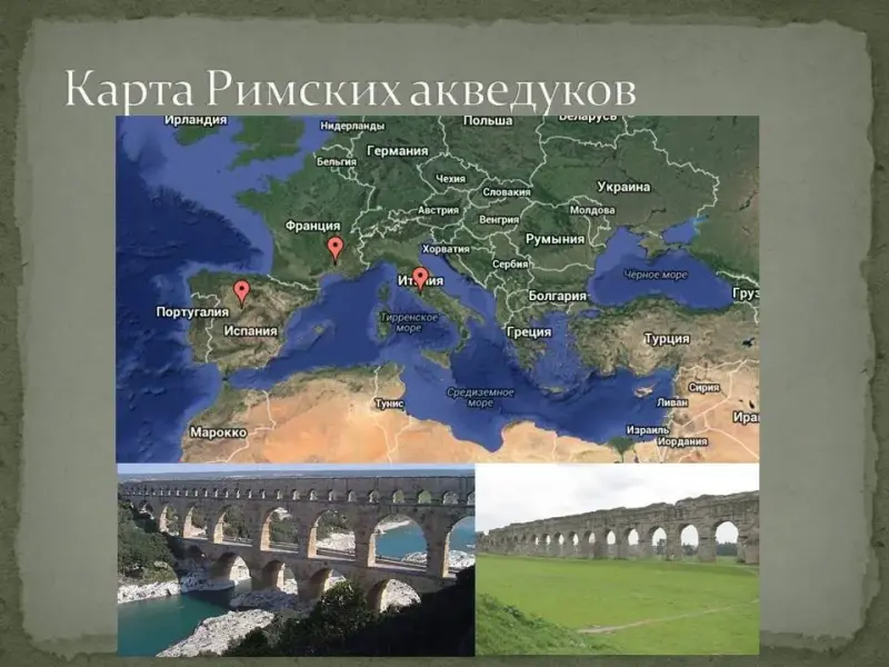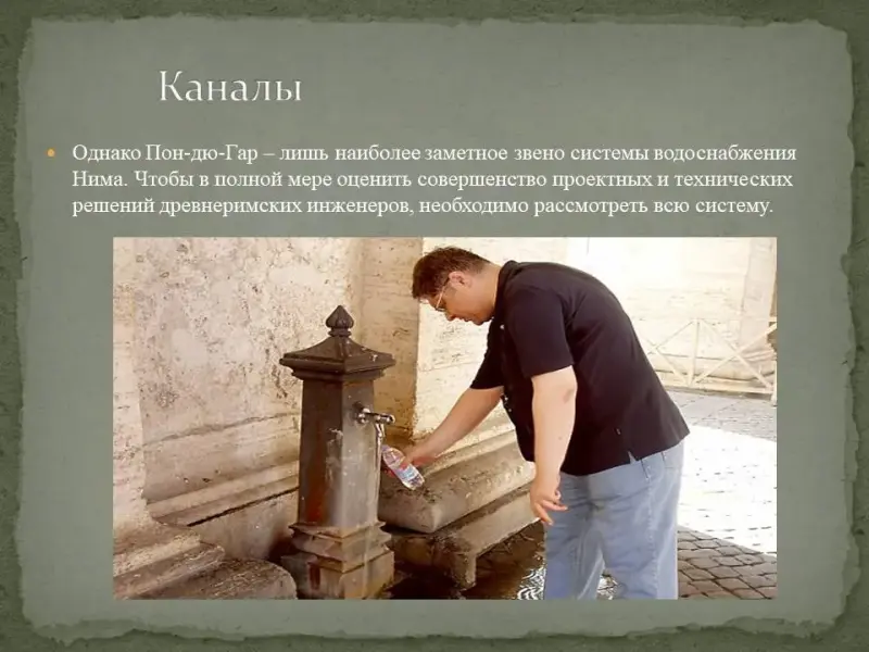 Слайд 5. Водоснабжение занимает особое место в жизни любого города. Сохранившиеся до наших дней остатки древнеримских водопроводов свидетельствуют о высочайшем уровне развития инженерной мысли для античного мира.