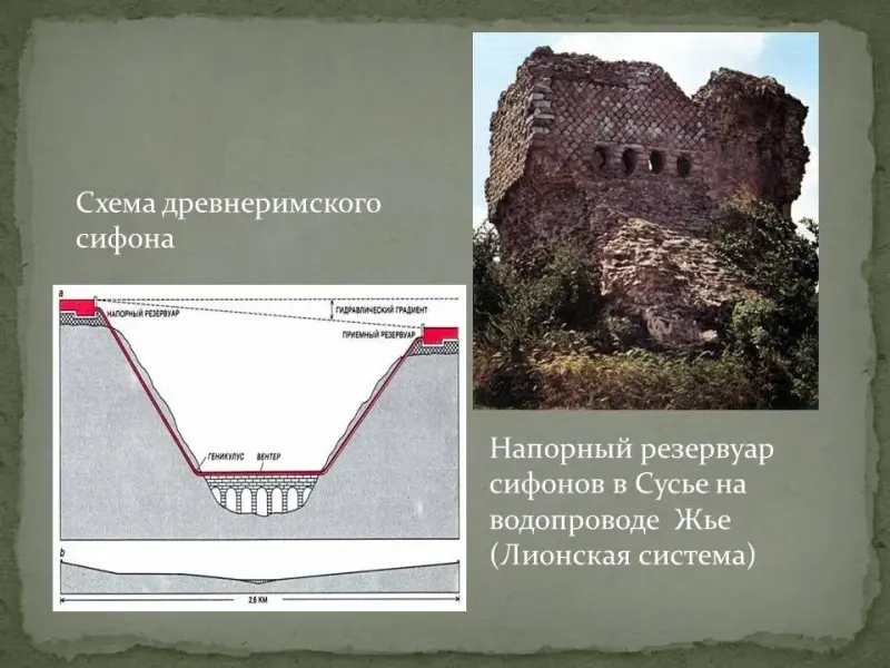 Сифон - это труба, по которой жидкость переливается с одного уровня на другой через промежуточное возвышение, и по форме это сооружение напоминает букву «П». в Древнем Риме применялся обратный сифон, или дюкер. В нем жидкость движется по U-образной траектории. Римские сифоны имели значительную длину, поэтому гидравлические потери в них становились заметными, и приемный конец приходилось устраивать на уровне несколько ниже подающего конца.