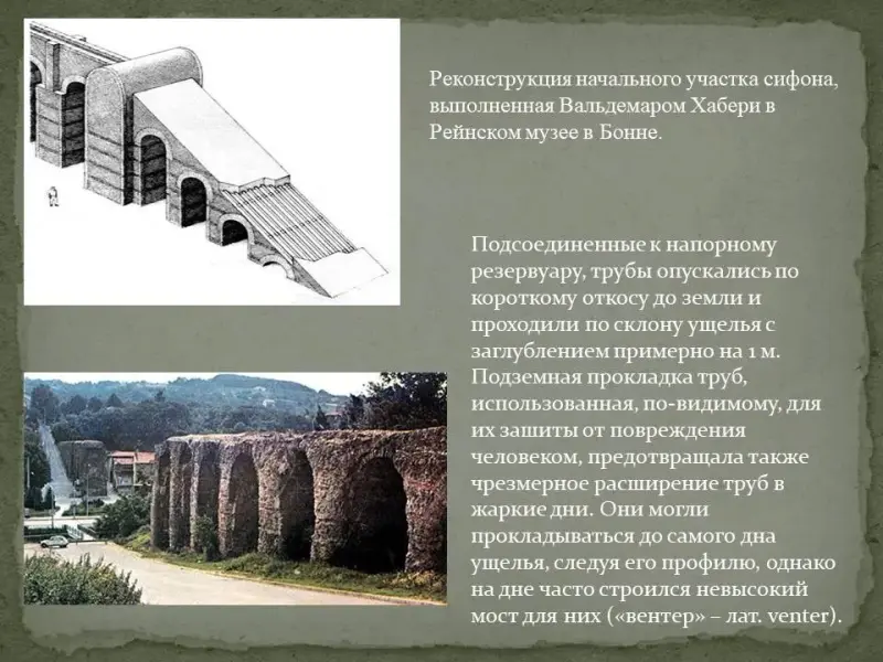 Слайд 14. На дне ущелья часто строился невысокий мост для труб («вентер» - лат. venter). Вентер создавал два резких перегиба («геникулус» - лат.geniculus) на концах моста, из-за чего могли возникать напряжения в стыках труб при ударе водяной струи. Однако он уменьшал статическое давление, т.к. перепад высот в сифоне был очень мал.