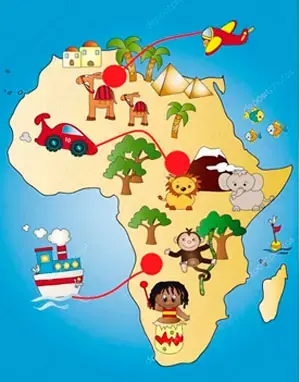 Условия: письмо от доктора Айболита, географическая карта Африки с отметкой мест доставки воды, схемы для построения самолета, корабля и реактивного автомобиля, деревянный конструктор.